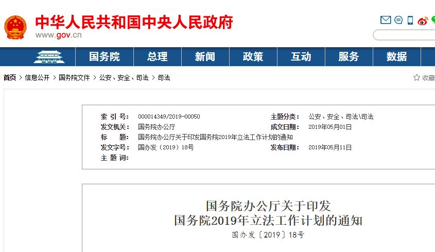 國務(wù)院辦公廳關(guān)于印發(fā)國務(wù)院2019年立法工作計(jì)劃的通知